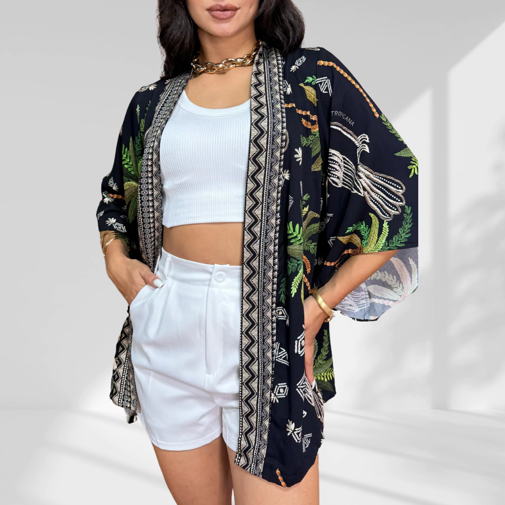 O Kimono é a peça perfeita para trazer leveza, estilo e um toque boho ao seu visual. Confeccionado em viscose pré-lavada, oferece mais durabilidade, conforto e um caimento fluido, ideal para composições casuais ou sofisticadas. Com mangas amplas e comprimento médio, valoriza a silhueta e proporciona liberdade nos movimentos. Seu design estampado e acabamento detalhado tornam a peça única e cheia de personalidade, perfeita para sobrepor looks básicos e elevar a produção com charme.